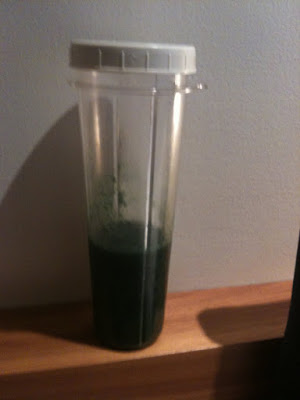 This one was the last of the cabbage, handful of baby spinach, 1 red apple, 2 kiwis and 2 bananas and some spirulina to give it that yummy green colour.